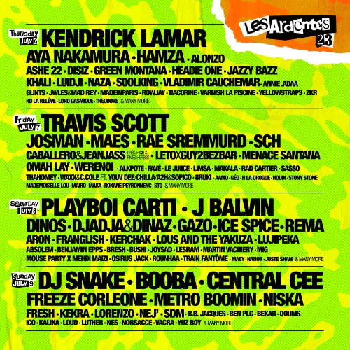 Pour cette édition, le festival belge des Ardentes a mis les petits plats dans les grands. Au menu, les plus grands rappeurs mondiaux et mondialisés, presque de quoi rivaliser avec Coachella et autres : Travis Scott, Kendrick Lamar, Metro Boomin, Central Cee, Rae Sremmurd, … Une grande majorité du rap francophone actuel est présente : essayez de trouver de gros artistes absents de la progra, vous verrez qu’on en fait vite le tour. Certains noms sont même événementiels, historiques, pas croyables, comme Kaaris, Freeze Corleone ou Booba. Le line-up est rare et précieux, de quoi convaincre tout passionné.